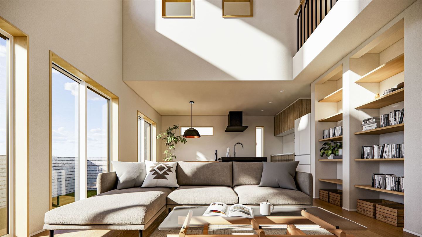 吹き抜けの最大の魅力は、垂直方向への広がりが生み出す「開放感」と「光の演出」です。1階と2階がひとつの大空間でつながることで、家族の気配が優しく伝わり、高窓から差し込む陽光が住まい全体を明るく満たします。