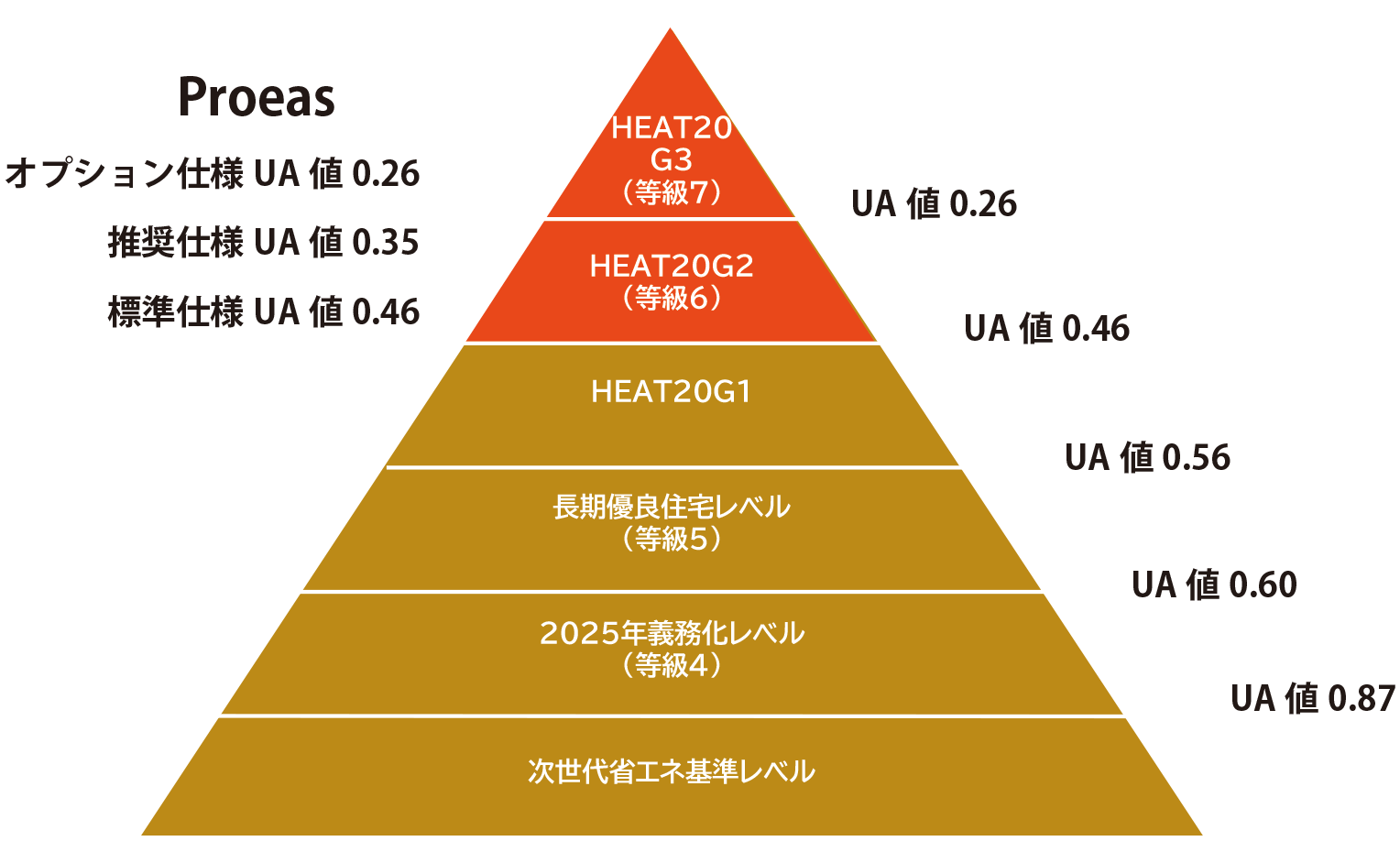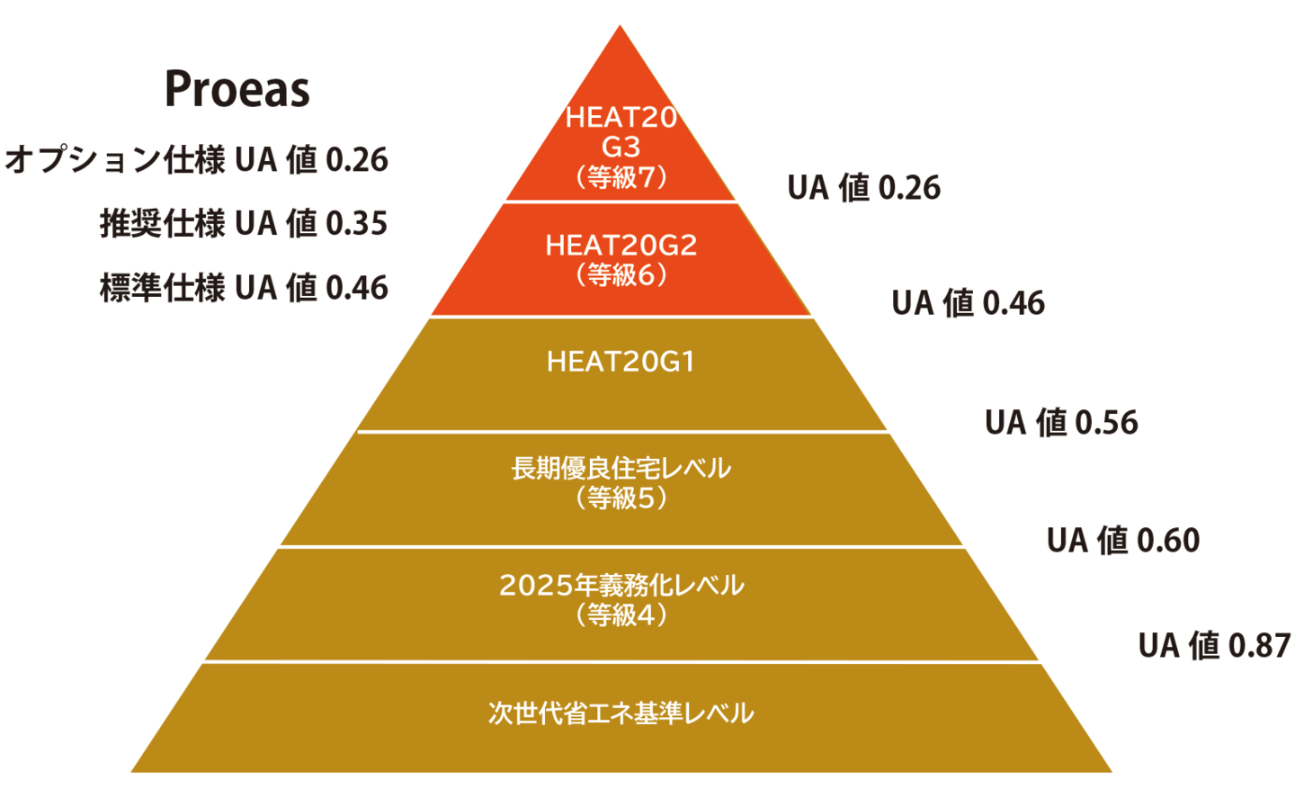 「Proeas」では、2階建ての一般的な間取りの場合、「HEAT20G2/等級6(UA値0.46)」を超える性能を標準としております。UA値は家の大きさや間取り・階数等によってもその数値は異なりますが、「UA値0.35」を推奨する断熱性能とし、この地域においても非常に優れた断熱性能の建物を実現しています。なお、オプションとして、最高レベルであるHEAT20G3・断熱等級7もクリアするご提案も充分に可能です。