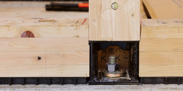 柱を基礎に直接ボルトで固定する「柱脚金物」を採用。大地震の揺れでも柱が基礎から引き抜かれるのを防ぎます。